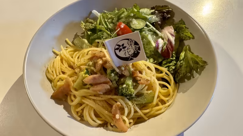 早稲田通り沿いの Whistle CAFE さんにて “如月パスタ” が販売されています。柚子胡椒が入っているとのことですが,少し辛い程度で唐辛子感は抑えめです。スパゲッティの具はブロッコリーとソーセージで,サラダも添えられています。